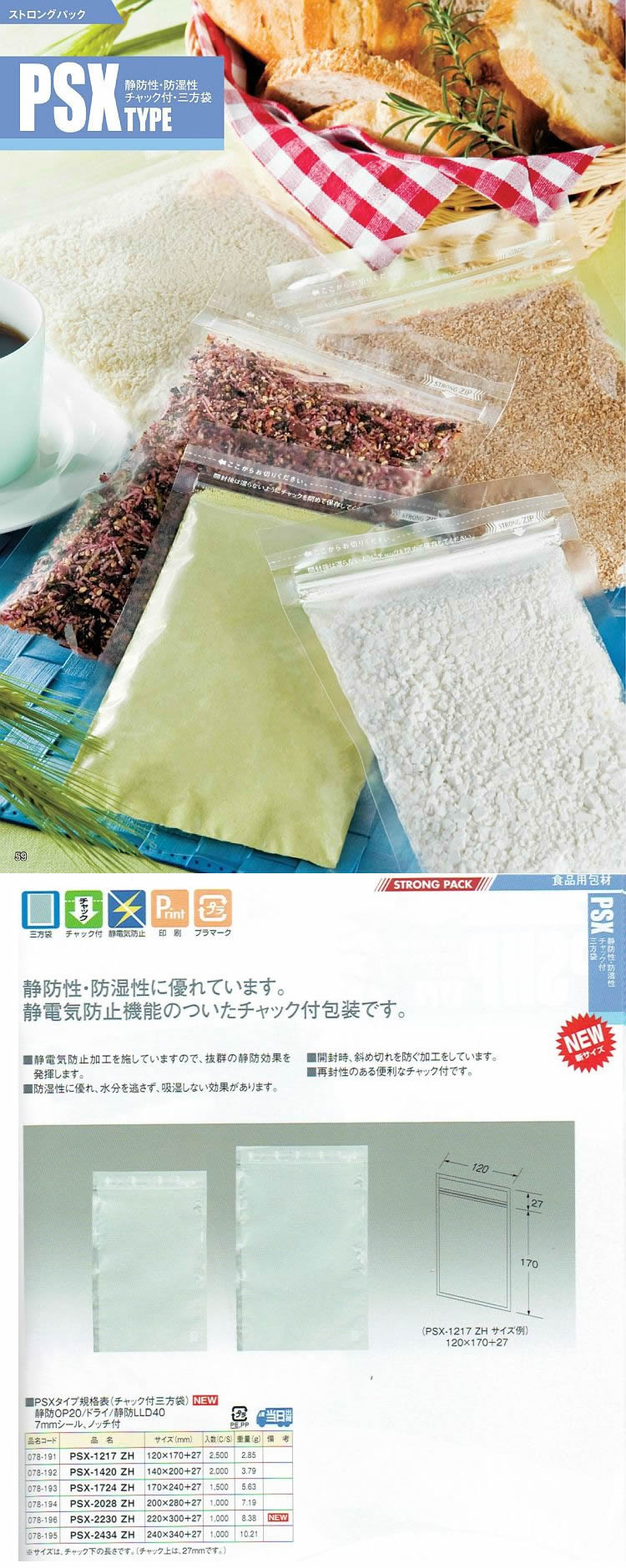 PSXタイプ三方袋は静防性・防湿性に優れており、静電気防止機能のついたチャック付包装です。開封時、斜め切れを防ぐ加工をしています。